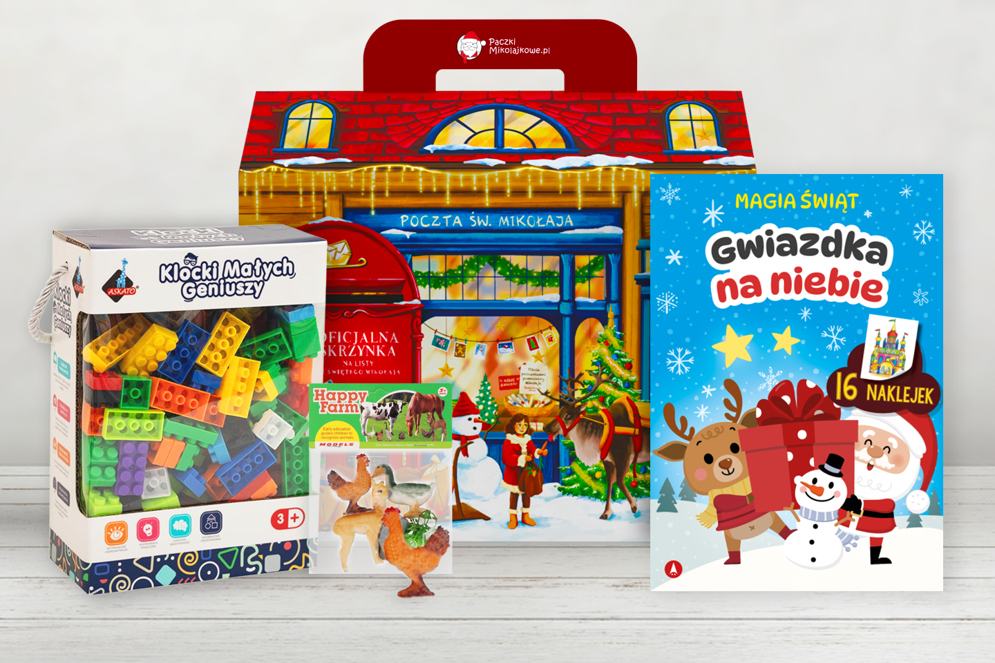 Paczka z zabawkami zawiera zestaw klocków konstrukcyjnych, który nie tylko dostarczy świetnej zabawy, ale także wspiera rozwój kreatywności i koordynacji ręka–oko. Oprócz tego w paczce znajdują się figurki zwierząt gospodarskich, zachęcające do rozwijania wyobraźni oraz tworzenia własnych historii i scenariuszy zabaw. Całość uzupełniają świąteczne ćwiczenia z naklejkami, przynoszące dziecku radość z ukończonych zadań i wspierające jego dalszy rozwój.